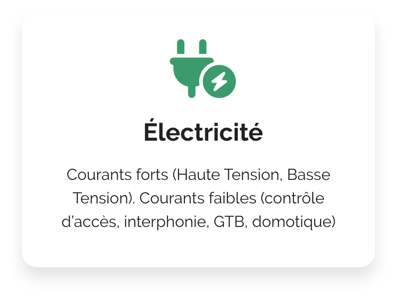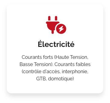 Courants forts (Haute Tension, Basse Tension). Courants faibles (contrôle d’accès, interphonie, GTB, domotique)